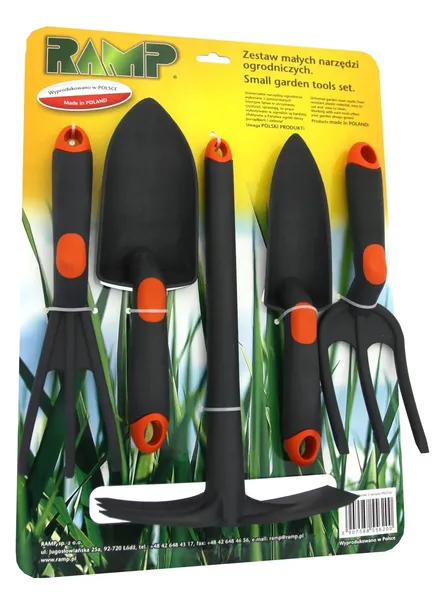 W skład zestawu wchodzą: widełki, uniwersalna łopatka, łopatka wąska, motyczko - grabki, pazurki.
