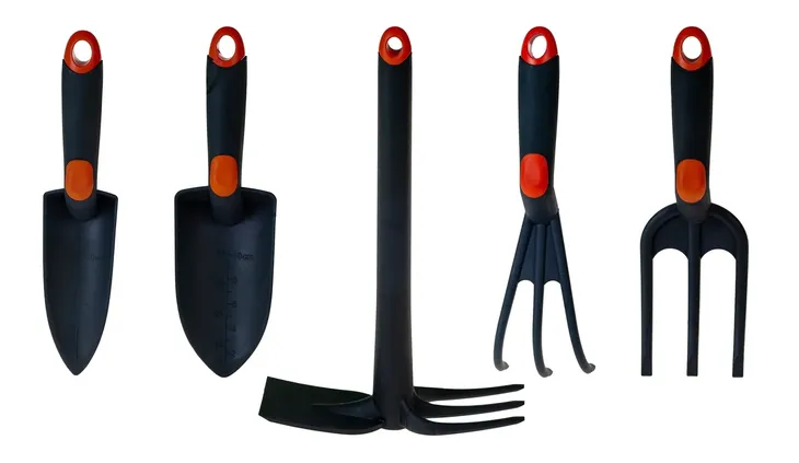 W skład zestawu wchodzą: widełki, uniwersalna łopatka, łopatka wąska, motyczko-grabki, pazurki.