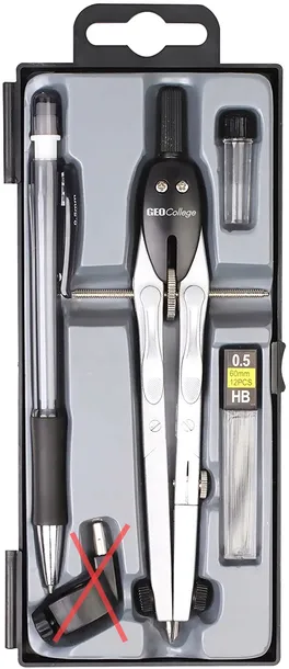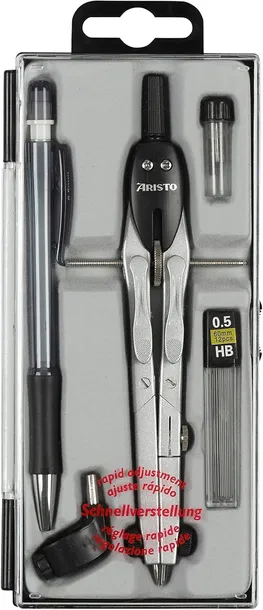 Długopis 0.5 z wkładami wymiennymi. Uniwersalny kamień cyrkielowy. Mechanizm dźwigniowy z centralnym kołem do precyzyjnej regulacji. 2 przeguby, z czego 1 przegub do nasadek o średnicy 4,0 mm. Ramię i mechanizm z cynkowego odlewu ciśnieniowego.