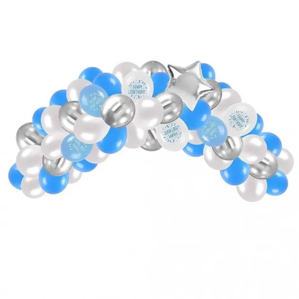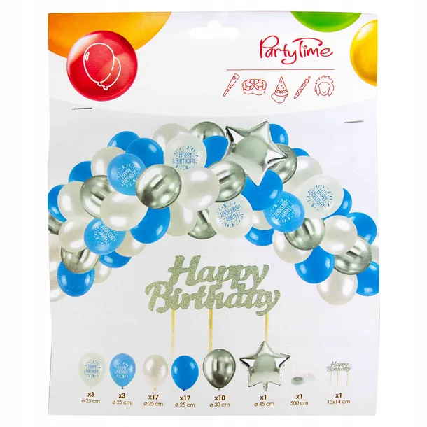 Zestaw dekoracji urodzinowych składający się aż z 53 elementów. To kompletna aranżacja imprezy urodzinowej dla chłopca lub fanów połączenia niebieskiego ze srebrem. W zestawie: - 34 balony lateksowe w kolorach niebieskim (x17) i białym (x17), wielkości 25 cm - 6 balonów lateksowych z nadrukiem napisu Happy Birthday, w kolorach niebieskim (x3) i białym (x3) o wielkości 25 cm - 10 balonów lateksowych z efektem chromu w kolorze srebrnym. Wielkość balonów to 30 cm, - balon foliowy w kształcie gwiazdki w kolorze srebrnym, wielkości 45 cm, - topper na tort urodzinowy z napisem Happy Birthday podkreślający charakter okoliczności. Topper w kolorze srebrnym o wymiarach 13x14 cm, - taśma do girland balonowych długości 5 m