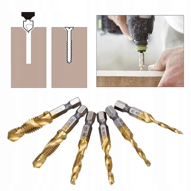 ✅M3 x 0,5mm - 53mm M4 x 0,7mm - 53mm M5 x 0,8mm - 55mm M6 x 1,0mm - 55mm M8 x 1,25mm - 57mm M10 x 1,5mm - 57mm Materiał: stal Rodzaj stali: szybkotnącej HSS Chwyt: 6 kątny Typ chwytu: bit 1/4' Urządzenia: do wkrętarek Kolor: złoty