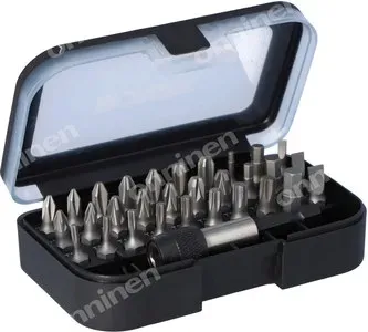 Wysokiej jakości 31-częściowy podstawowy zestaw końcówek znajduje się w plastikowej walizce. Końcówki wykonane są ze stali S2 i fosforanowane cynkowo. 1/4" x 25 mm końcówki: PH 1x2 / 2x3 / 3x2 PZ 1x2 / 2x3 / 3x2 TX 8/9/10/15/20/25/27/30 Hex 2/3/4/5/6 SL 3 / 4,5 / 5, 5 1 x 60 mm uchwyt do szybkiego zwalniania Zapoznaj się z szeroką gamą produktów Ironside w sklepie internetowym Onninen i najbliższym sklepie Express.
