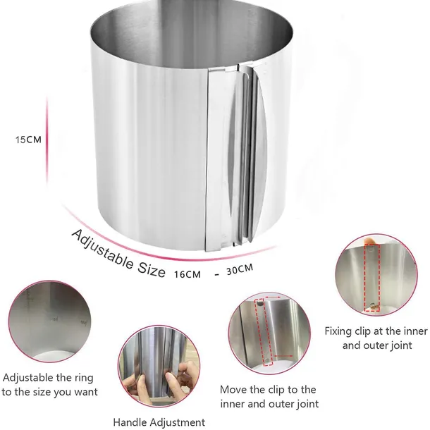 Regulowany pierścień do tortów wysokość 15 cm, stalowy pierścień do ciast z skalą, regulacja precyzyjna do łatwego przygotowania kremów, warstwowych i tortów tematycznych