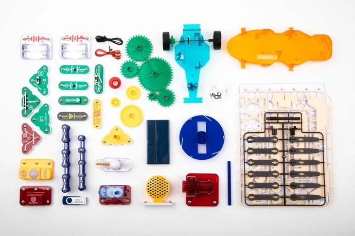 - 63 części (samolot, mini samochód, głośnik, detektor ruchu, silnik ze skrzynią biegów)