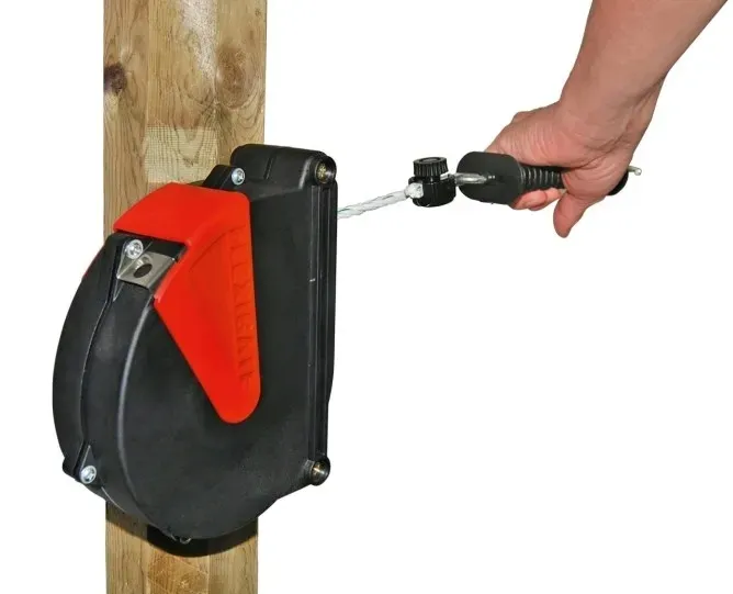 Zestaw Flexigate umożliwa podłączenie wejścia padoku do obwodu elektrycznego zawartego w ogrodzeniu. W trakcie otwarcia taśma lub linka zostaje zwinięta automatycznie wewnątrz kasety.