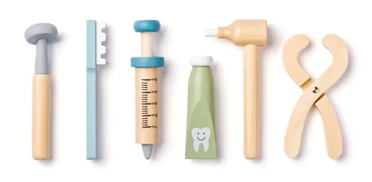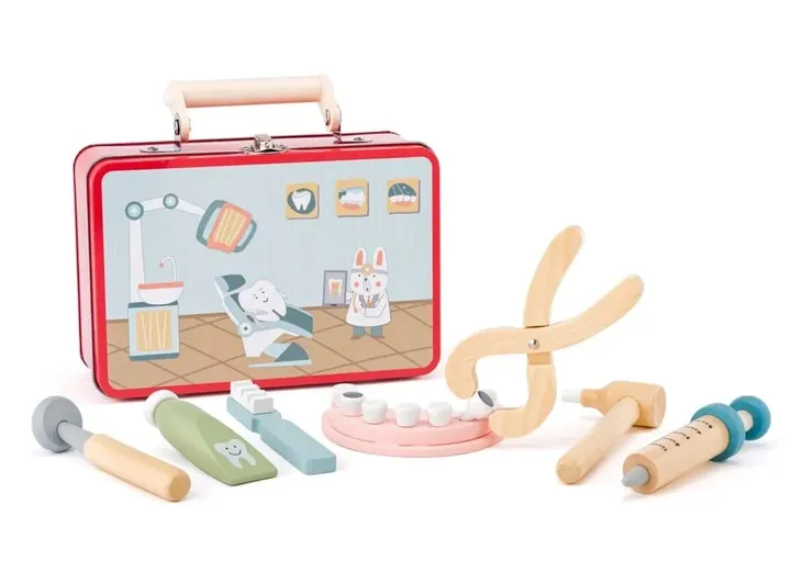 Przybory lekarskie wykonane z drewna, bezpieczne dla dzieci.