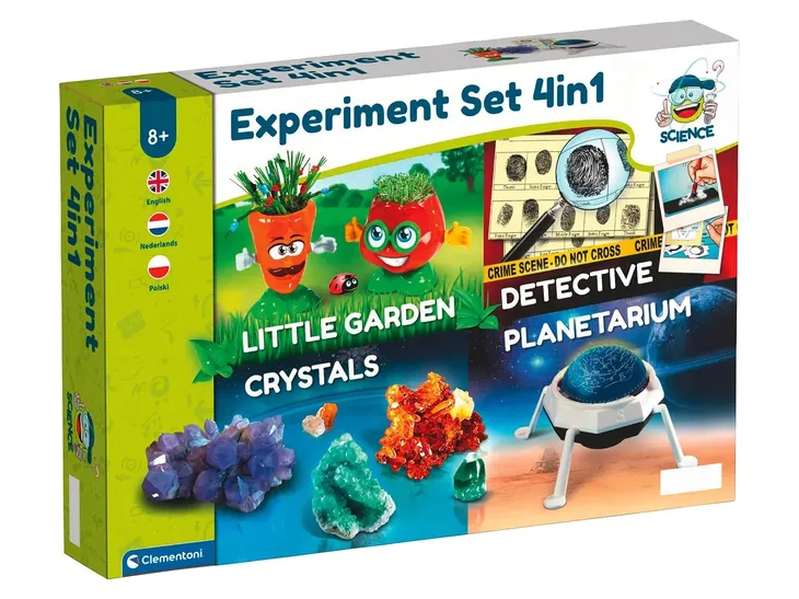 zabawny zestaw naukowy z mnóstwem aktywności, które pozwalają spróbować 4 różnych aktywności: hodowla kryształów, botanika, zabawy detektywistyczne i astronomia