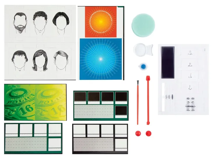 Detektyw: lupa, pędzel, czarna błyszcząca płytka (do odcisków palców), gąbka do czernidła drukarskiego, czernidło drukarskie, materiał do portretów pamięciowych, plastikowy przycisk, tarcza obrotowa do tajnych kodów, karty z próbkami odcisków palców