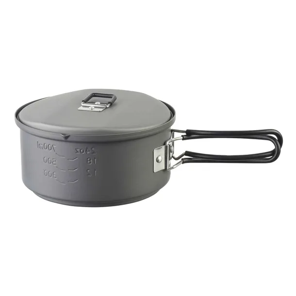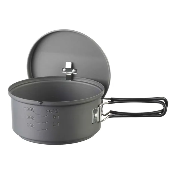 Większość elementów wykonano z twardego anodowanego aluminium, które bardzo dobrze przewodzi ciepło i cechuje się wysoką odpornością na uszkodzenia. Garnek o pojemności jednego litra oraz pokrywka posiadają składane uchwyty ze stali nierdzewnej 18/8, pokryte silikonową powłoką chroniącą przed poparzeniem i poprawiającą chwyt. Na ściance garnka umieszczono czytelną skalę w ml i oz, ułatwiającą precyzyjne dozowanie składników.