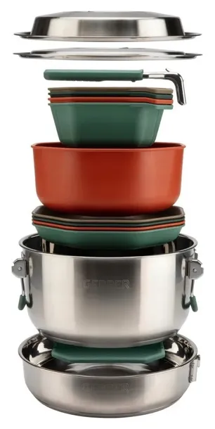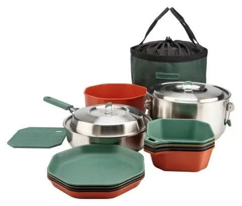 16-częściowy zestaw do gotowania ComplEAT ma wszystko, czego potrzebujesz, aby łatwo nakarmić grupę głodnych wczasowiczów. Ten zestaw naczyń kempingowych składa się z garnka i patelni do smażenia z dużą powierzchnią do gotowania i 3-warstwową konstrukcją podstawy zapewniającą równomierne rozprowadzanie ciepła. Zestaw zastawy stołowej pomaga w pracach przygotowawczych i zapewnia miejsce na obfite porcje, gdy posiłek jest już gotowy. Kiedy wozy kempingowe są pełne, wszystko można spakować do torby do przechowywania, co zapewnia bezpieczne i kompaktowe przechowywanie pomiędzy wyprawami.