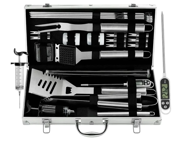 Grilljoy 25-częściowy zestaw akcesoriów do grillowania w walizce ze stali nierdzewnej, specjalne przybory do grilla z antypoślizgowymi uchwytami – idealny prezent na Dzień Ojca, urodziny, Boże Narodzenie