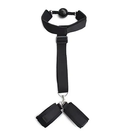 Czarny zestaw do krępowania z kneblem na usta. Pięć uzupełniających się elementów, łatwe łączenie dzięki karabińczykom, solidne wykonanie.