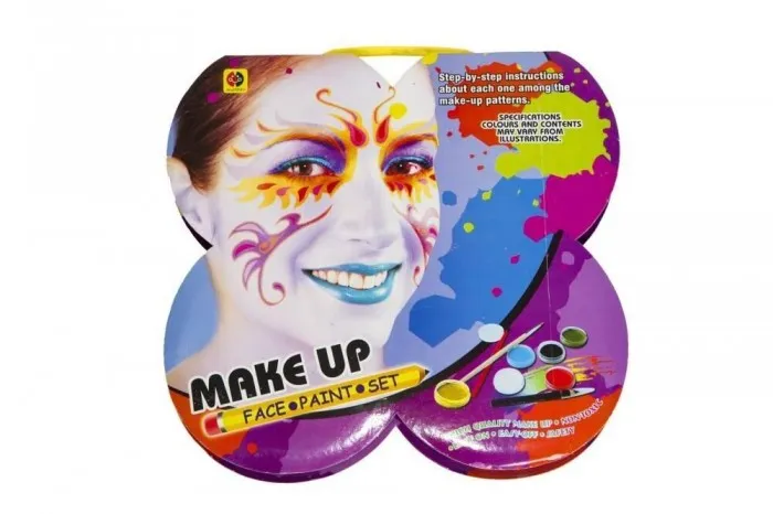 Zestaw do malowania twarzy, który zawiera: instrukcję, 2 pędzelki, 2 kredki, 6 kolorów farb, 2 gąbki, lusterko. Produkt nie potrzebuje baterii. Zabawka przeznaczona dla dzieci powyżej 3 roku życia.