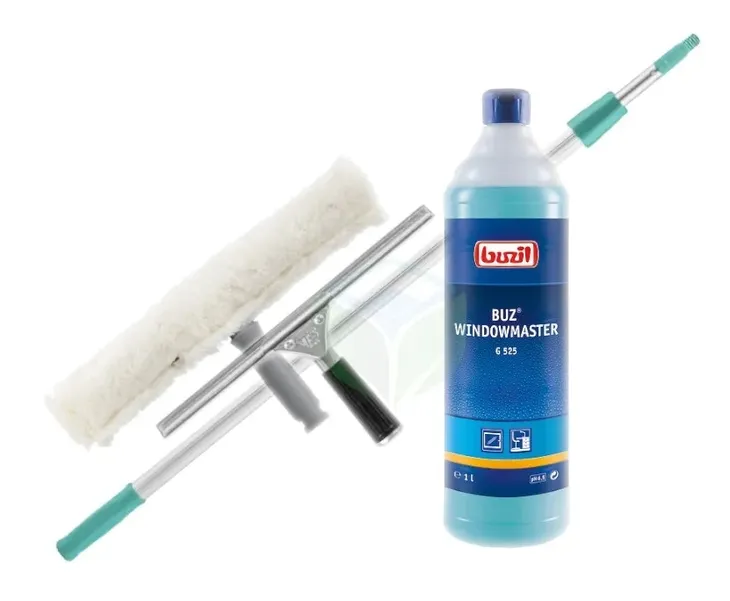 Profesjonalny zestaw włoskiej firmy TTS / PULEX złożony z myjki z wkładem barankiem oraz ściągaczki 35cm, kija teleskopowego 2 x 1,50m, a także ze skoncentrowanym płynem do mycia przeszkleń Buzil G525 Buz windowMaster. Idealne rozwiązanie do dużych powierzchni jak również na wysokości po za zasięgiem rąk dla osób ceniących jakość kupowanych produktów.