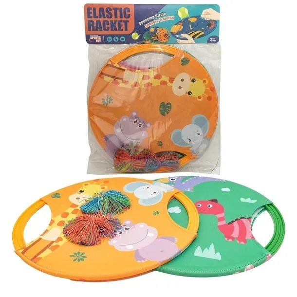 W skład zestawu wchodzą dwie obręcze oraz dwa elastyczne pompony do odbijania. Można odbijać samodzielnie ćwicząc koordynację ruchową lub grać w dwie osoby. Świetna propozycja do zabawy dla dzieci na zewnątrz. Średnica pomponów ok. 11 cm Średnica tarczy: 34 cm . Ilość elementów: 2 tarcze oraz 2 elastyczne pompony do odbijania. Kolor produktu: wielokolorowy.