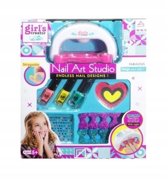 Zestaw do paznokci z suszarką, 3 kolorami lakierów, pilniczkiem, separatorami oraz ozdobami. Włącz suszarkę i ciesz się nowym manicurem. Lampka ze światłem. Produkt zapakowany w kartonowe opakowanie z przezroczystym okienkiem. Zabawka działa na baterie.
