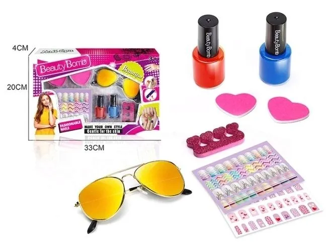 Odkryj świat mody i kreatywności z zestawem BeautyBombs! Ten kompleksowy zestaw do stylizacji to spełnienie marzeń każdej małej miłośniczki piękna. W eleganckim pudełku znajdziesz dwa żywe lakiery do paznokci - intensywny czerwony i wyrazisty niebieski - które pozwolą na stworzenie niezliczonych kombinacji. Dołączone brokatowe separatory do palców w kształcie serduszek i stópek zapewnią komfort podczas malowania, a dwa urocze, różowe gąbki w kształcie serca ułatwią precyzyjną aplikację. Całość uzupełnia bogaty arkusz z naklejkami na paznokcie, oferujący szeroki wybór wzorów - od geometrycznych zygzaków po słodkie serduszka, co pozwala na personalizację każdego manicure. Ale to nie wszystko! Zestaw zawiera również stylowe okulary przeciwsłoneczne z lustrzanymi soczewkami, dodające szyku każdej stylizacji. Wszystkie elementy zostały zaprojektowane z myślą o delikatnej skórze, gwarantując bezpieczną i radosną zabawę. Zestaw BeautyBombs to doskonały sposób na rozwijanie kreatywności i poczucia stylu u dzieci, zachęcając je do wyrażania siebie poprzez modę. Idealny na prezent!