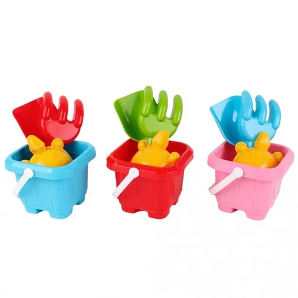 W skład zestawu wchodzi wiaderko, które pełni funkcję pojemnika na piasek. Można nim również bezproblemowo przenosić wodę i inne potrzebne materiału do budowy zamków z piasku lub innych konstrukcji. Dodatkowo, w zestawie znajduje się również foremka w kształcie żółwika oraz łopatka z grabkami, które sprawdzą się doskonale podczas zabaw w piasku.