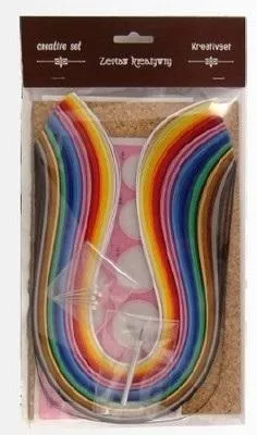 Zestaw zawiera szablon do quillingu wielkości 21x10,5 cm z 27 otworami kołowymi o średnicach 2-40 mm,pod-kład korkowy do quillingu wielkości 25x15,5 cm , nawijak metalowy do quillingu, 6 szpilek do quillingu, 280 pasków do quillingu w 28 kolorach oraz instrukcję w języku polskim
