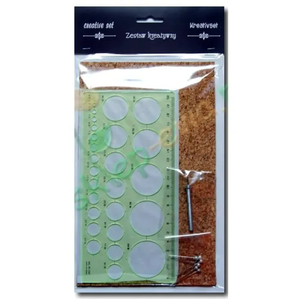 Zestaw „standard” zawiera szablon do quillingu o wielkości 21x10,5 z 27 otworami kołowymi o średnicach od 2-40mm, podkładkę korkową 25x15, bardzo popularny nawijak metalowy, 6 szpilek oraz instrukcję w języku polskim.