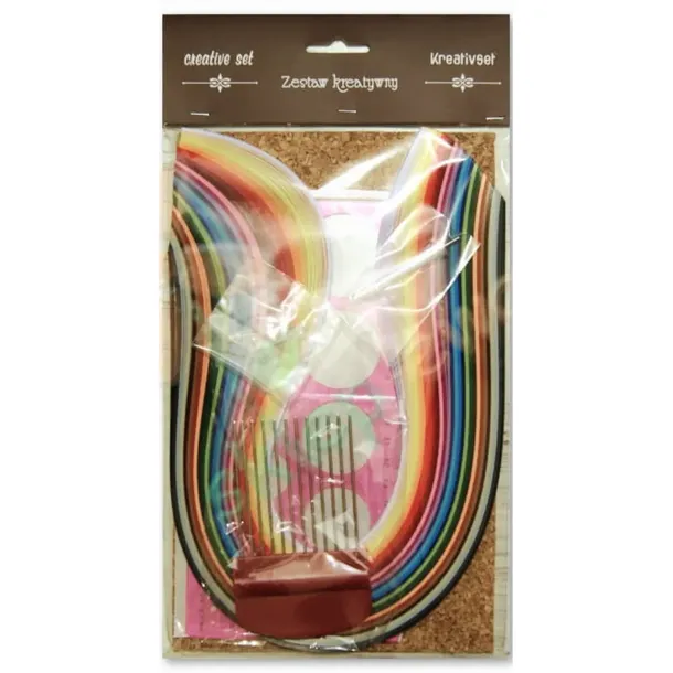 Zestaw zawiera kolorową instrukcję w języku polskim zawierającą opis techniki quillingu oraz podstawy pracy w tej technice, a także kilka informacji historycznych o quillingu. Zestaw „maxi”: zawiera szablon do quillingu o wielkości 21x10,5 z 27 otworami kołowymi o średnicach od 2-40mm, podkładkę korkową 25x15cm, bardzo popularny nawijak metalowy, grzebień do quillingu, 6 szpilek i bogaty zestaw kolorowych pasków papieru (szerokość 3 mm) oraz instrukcję w języku polskim.