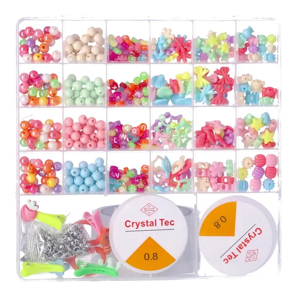 Koraliki posegregowane sa w praktyczny organizer, który posiada 26 przegród ze wszystkimi akcesoriami.