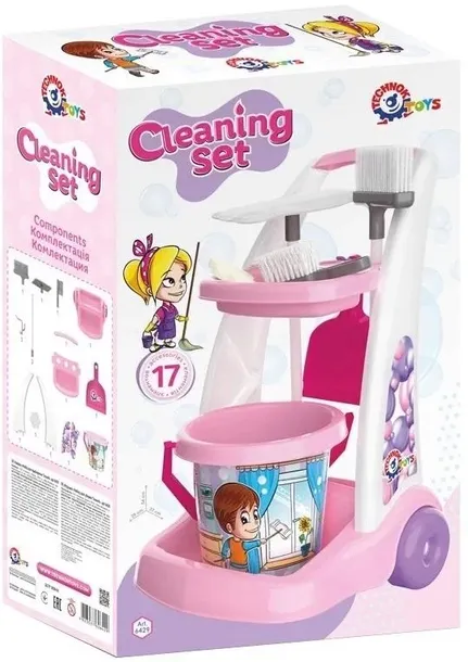 Zestaw do czyszczenia TechnoK zawiera jasne wiadro z kolorową naklejką wykonaną w technologii IML, mop, miotłę, szczotkę i szufelkę. Opakowanie - jasne pudełko 37,5x20x61,8 cm
