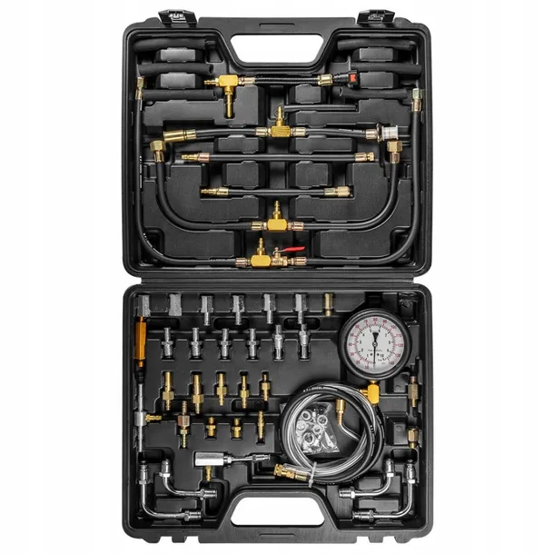 Zestaw do diagnostyki systemów Common Rail, to niezawodny produkt przeznaczony dla profesjonalistów do sprawdzania systemów wtryskowych w silnikach benzynowych. Wchodzący w skład zestawu manometr pozwala na zakres testowania do 140 PSI/10 bar. W zestawie znajdują się adaptery z szybkozłączem i wbudowanym zaworem odcinającym. Giętki wężyk pozwala na dotarcie do trudno dostępnych presostatów olejowych. Komplet przeznaczony do testowania układów wtryskowych: układ K - i KE - Jetronic sis, układ KE - Jetronic kic, układ L - Jetronic liw. Umożliwia pomiar ciśnienia w pompach oraz pomiar powrotu ciśnienia. Zestaw zapakowany w walizkę z tworzywa sztucznego.