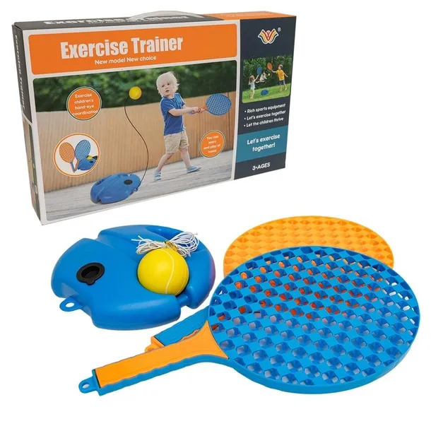 Zestaw treningowy do tenisa W zestawie znajdują się: dwie rakietki, stabilna podstawka z możliwością dociążenia wodą, poręczny uchwyt do przenoszenia oraz wyżłobienie na piłeczkę. Do kompletu dołączona jest również piłeczka na sznurku, którą należy przymocować do podstawki. Wymiary opakowania: 39 x 8 x 25 cm Wymiary rakiety: 21 x 39 cm; sznurek 30 cm z piłeczką o średnicy 6 cm Wiek 3+