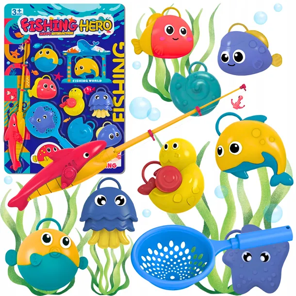 Łowienie rybek: Morskie stworzenia w zestawie zostały wyposażone w specjalne uchwyty, które idealnie pasują do haczyka. Rybki należy złapać za wystające elementy przy pomocy haczyka i wciągnąć je do siebie. Zabawa wydawać się może bardzo prosta, ale tak naprawdę wymaga dużo cierpliwości i skupienia. Dziecko uczy się opanowania, a przy tym ćwiczy koordynację ręka-oko. Łowić można także za pomocą dołączonego sitka.