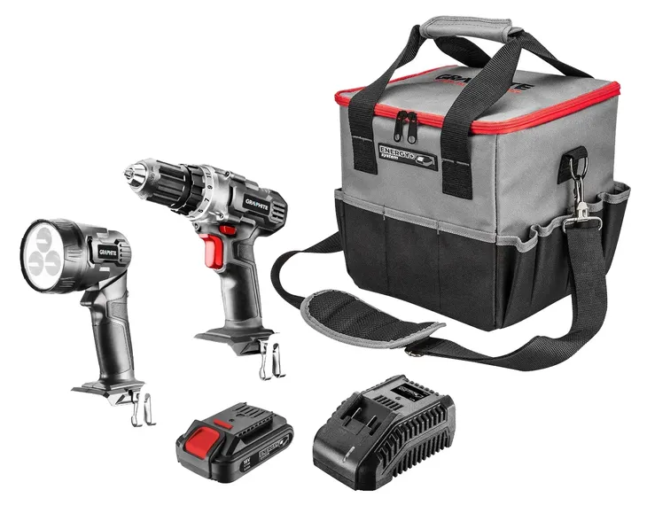 Zestaw elektronarzędzi 18V Li-Ion GRAPHITE Energy+. W skład zestawu wchodzą: wiertarko-wkrętarka (58G000), latarka (58G007), akumulator 2.0Ah (58G002), ładowarka (58G001) oraz torba na elektronarzędzia (58G015). Zestaw stanowi atrakcyjny punkt wyjściowy dla osób rozpoczynających kompletację elektronarzędzi w systemie Energy+. Zawiera on najbardziej podstawowe, a zarazem wszechstronne elementy systemu Energy+.