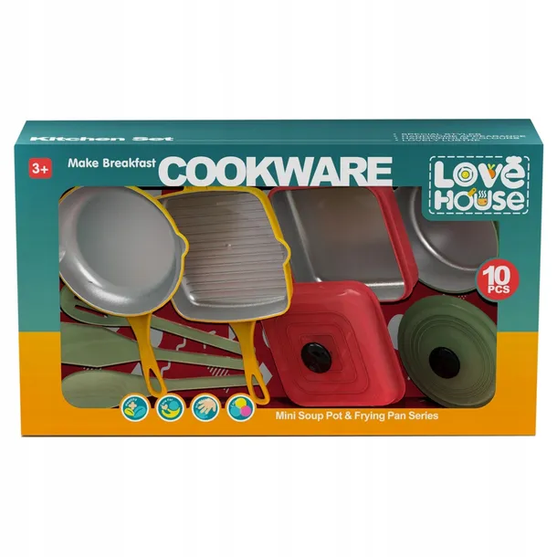 4 naczynia do gotowania lub smażenia, 2 pokrywki, 4 łyżki oraz podkładka pod gorący garnek.