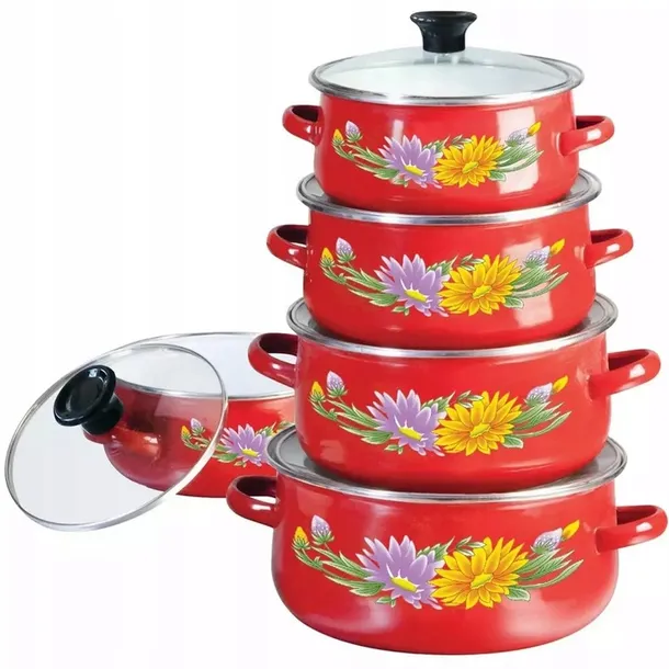 Zestaw garnków emaliowanych wzór retro. Akutermiczne, wysokiej jakości dno, które świetnie zatrzymuje i rozprowadza ciepło. Dzięki temu żywność nagrzewa się szybko a ciepło jest dobrze magazynowane. Garnki nadają się do wszelkich źródeł ogrzewania: kuchenki elektryczne, gazowe, ceramiczne i halogenowe (z wyjątkiem indukcyjnych). Oferowany komplet garnków to gwarancja zdrowego przygotowania jedzenia. Gotowanie w niewielkiej ilości wody, smażenie z oszczędnym użyciem tłuszczu minimalizuje utratę witamin, minerałów i smaku!