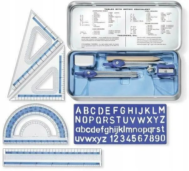 W skład zestawu wchodzą:- szablon (literki/cyferki)-temperówka- gumka- ołówek- dwa cyrkle- dwie ekierki-linijka- kątomierz