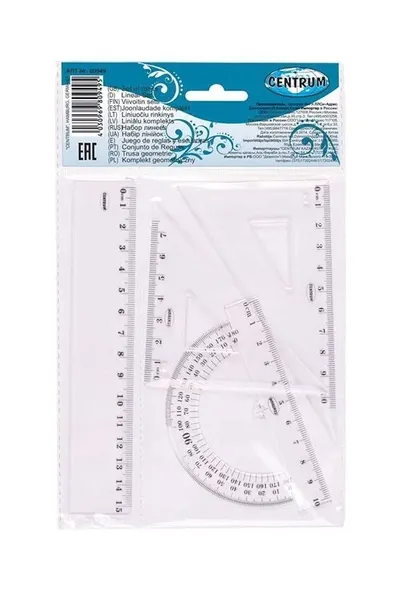 Zestaw geometryczny z plastiku, zawiera linijkę 15 cm, 2 ekeierki oraz kątomierz.