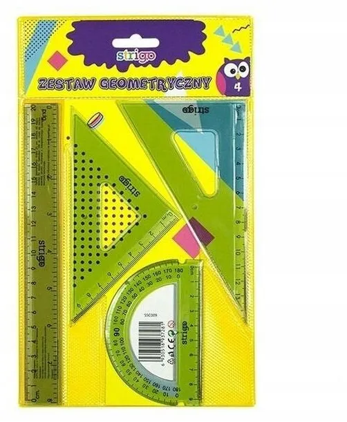 Zestaw geometryczny: linijka 20 cm, ekierka 45 stopni, ekierka 60 stopni, kątomierz 180 stopni.Linijki są bardzo wysokiej jakości, wykonane z transparentnego czarnego tworzywa sztucznego.