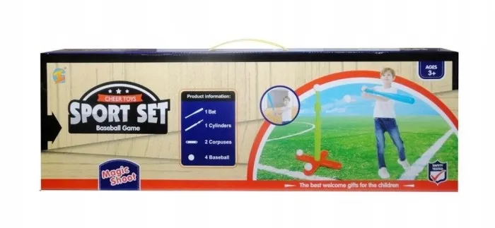 Zestaw do gry w baseball. Dzieci będą mogły zagrać w tą grę co umili im tym samym czas spędzany na dworze. W zestawie: kij, 4 piłki, 1 cylinder, 2 korpusy do ustawienia stojaka na piłki. Produkt zapakowany w kartonowe opakowanie. Produkt przeznaczony dla dzieci od 3 lat. P0odane wymiary są wymiarami opakowania.