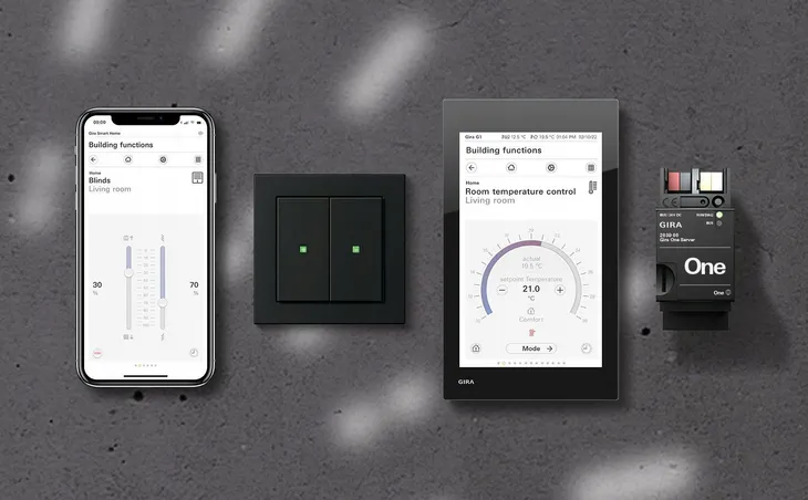 Funkcje systemu Gira One Smart Home można obsługiwać w zwykły sposób za pomocą łączników. Przyciski są dostępne w wersji pasującej do wszystkich programów stylistycznych Gira System 55 i Gira F100. Dodatkowo możliwe jest sterowanie za pomocą aplikacji Gira Smart Home, za pośrednictwem zainstalowanej na stałe centrali obsługowej Gira G1 lub mobilnie przy użyciu smartfona lub tabletu.