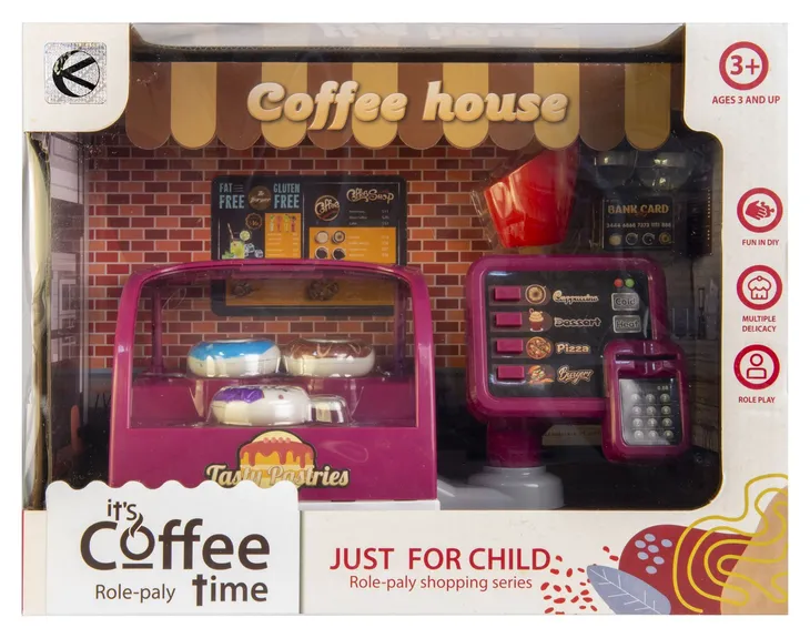Zestaw dla każdego dziecka, które uwielbia wcielać się w rolę dorosłych. Kawiarnia Coffee House jest w kolorze różowym z elementami białymi. Prezentuje się bardzo wiarygodnie i stylowo, dlatego też z pewnością zachwyci każdą dziewczynkę. W zestawie znajdują się słodkości takie jak donaty w różnych smakach. Możliwość wcielenia się w rolę sprzedawcy łakoci z pewnością zachwyci każdego malucha.
