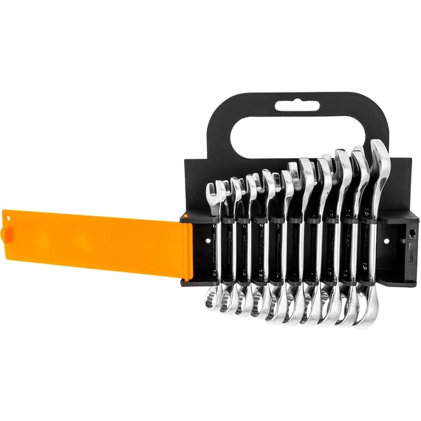 Zestaw 10 kluczy płasko-oczkowych krótkich, chromowanych w zakresie rozmiarów 10-19mm.