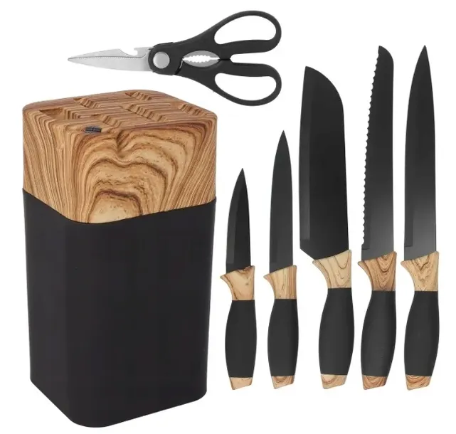 ZESTAW KOMPLET 5 NOŻY KUCHENNYCH + BLOK NOŻYCZKI 7 ELEMENTÓW SUPER OSTRE