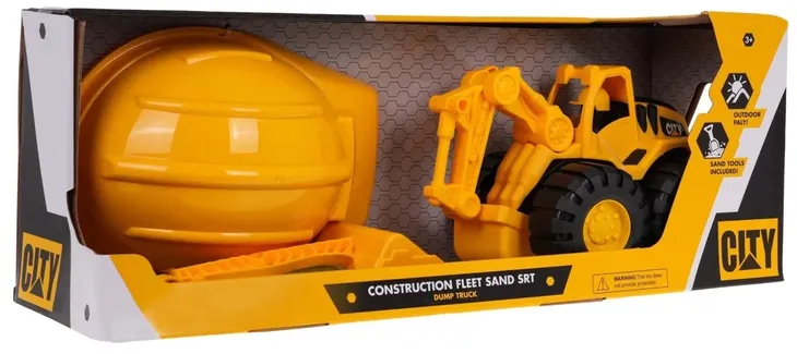 Zestaw do piasku z koparką, kaskiem, grabkami i łopatką dla dzieci od 3-go roku życia. Zestaw wykonany został z najlepszej jakości materiałów. Koparka posiada ruchome elementy. Manualnie możemy podnosić i opuszczać ramię i łyżkę koparki. Duże koła umożliwiają jazdę po każdym terenie. Do zestawu dołączony jest kask dla małego budowlańca oraz grabki i łopatka do piasku.