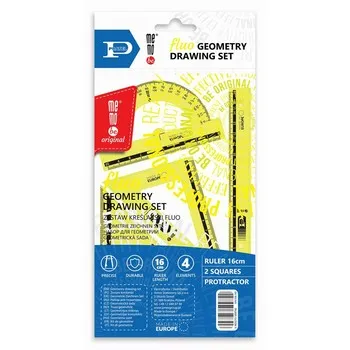 Zestaw kreślarski: 2 standardowe fluorescenscyjne ekierki 16 cm 45/60 stopni, kątomierz 10 cm/180 stopni, linijka 16 cm. Elementy zestawu posiadają trwałą nieścieralną podziałkę i zaokrąglone rogi dla bezpieczeństwa użytkownika. Precyzyjny nadruk skali ( do 0,001 cm).