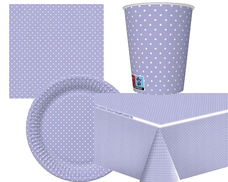 Zestaw KUBKI talerzyki serwetki obrus lawendowe NA URODZINY dekoracja stołu