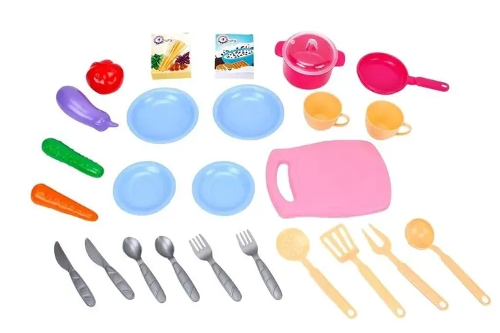 Kompletny zestaw: blat ze zlewem i kranem, deska kuchenna, patelnia z pokrywką, patelnia, łyżki 2 szt., widelce 2 szt., noże 2 szt., talerze 2 szt., duży do , skimmer, łopatka, gałka, ogórek, marchewka, bakłażan, pomidor, pudełka 2 szt.