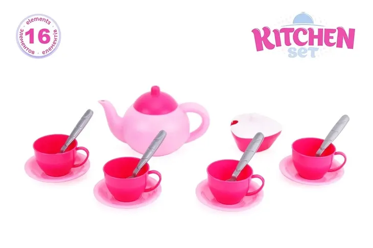 Kompletny zestaw : blat ze zlewem i kranem, garnek z pokrywką, patelnia, łyżka - 4 szt., widelec - 4 szt., nóż - 1 szt., talerz - 4 szt., filiżanka - 4 szt., spodek - 4 szt. ., foremki różnej wielkości - 16 szt., ogórek, marchew, bakłażan, pomidor, ziemniak, cebula, kukurydza, papryka, pudełko - 2 szt., stojak, chochla, duży widelec, łopatka, trzepaczka, tłuczek, deska, wałek do ciasta, gąbka, cukiernica z pokrywką, czajniczek z pokrywką.