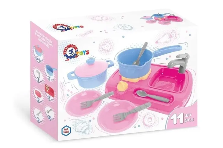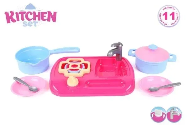 W skład zestawu wchodzą: zlewozmywak, kran, rondel, garnek z pokrywką, łyżki, widelce i talerze po 2 szt. Zabawka dla dzieci od 3 roku życia.