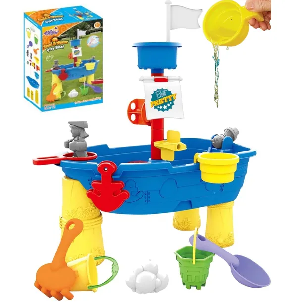 Prezentujemy świetny zestaw do piasku, piaskownicy, ogrodu i na plażę, a także na balkon. Stolik statek piracki z akcesoriami to zabawka, które na długi czas zajmie Twoje dziecko. Świetna kolorystyka i dużo elementów pełniących różne funkcje uatrakcyjnią dodatkowo zabawę.