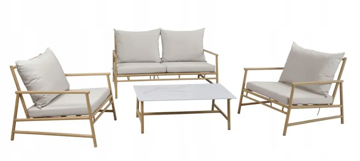 - Materiał: blat stołu - hartowane szkło; stelaż stołu, foteli, ławki - stal; siedziska i oparcia pokryte wodoodporną tkaniną olefin; wypełnienie - gąbka i włókna