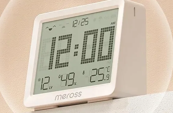 - Duży ekran i przyciski szybkiego dostępu: 3,7-calowy wyświetlacz LCD pokazuje w czasie rzeczywistym temperaturę, wilgotność powietrza, datę, godzinę, intensywność światła, komfort, stan baterii itd. W górnej części termometru znajdują się dwa przyciski szybkiego dostępu, za pomocą których można skonfigurować inteligentne sceny i łączyć inne produkty Meross.
